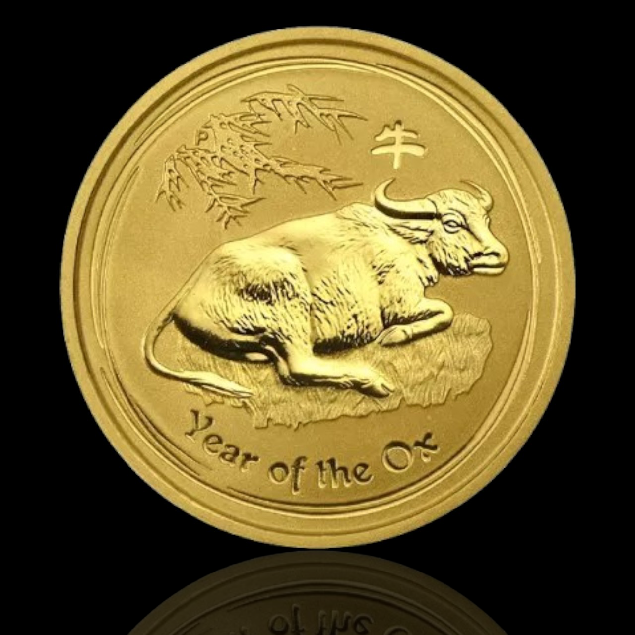 - Partea din spate: Prezintă un boul impresionant, culcat printre iarbă și ramuri de bambus. Include hierogliful chinezesc pentru „Bou” și inscripția „Year of the Ox”. În partea dreaptă se află sigla tradițională a monetăriei – litera „P” (Perth Mint). Realizarea se remarcă prin contrastul perfect între suprafețele mate și cele lucioase.