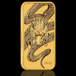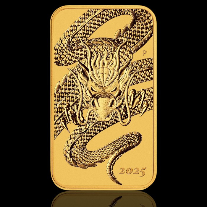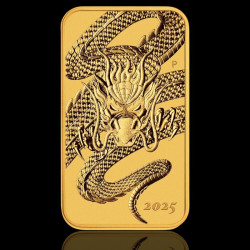 Moneda dreptunghiulară de aur „Dragon 2025” de 1 uncie troy (31,107 g) face parte dintr-o emisie limitată a Monetăriei Perth, inspirată de simbolismul cultural al dragonului – o creatură legendară cu rădăcini adânci atât în mitologia orientală, cât și în cea occidentală. În timp ce în tradiția occidentală dragonul este reprezentat ca o fiară înaripată care scuipă foc, în cultura orientală acesta simbolizează puterea, înțelepciunea și norocul. Interesant este faptul că în zodiacul chinezesc anul 2025 este Anul Dragonului de Lemn – o combinație rară și extrem de respectată, care apare o dată la 60 de ani.
