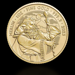 Seria Mituri și legende a monetării regale onorează personaje mitice din folclorul britanic, iar monedele de aur Merlin de 1 oz din 2023 fac parte din această colecție. Unul dintre cele mai faimoase personaje din legenda arthuriană este Merlin, care este adesea descris ca un vrăjitor puternic de mare putere și inteligență în mitologia arthuriană. Legenda spune că Merlin a fost mentorul lui Arthur și l-a ajutat în drumul său spre a deveni regele onorific al Camelotului.
