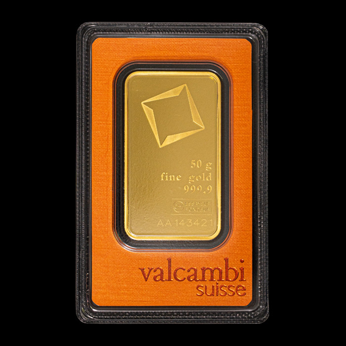 Fața fiecărei lingouri de aur de 50 de grame este gravată cu sigla Valcambi Suisse, împreună cu gravuri cu greutatea, puritatea, conținutul de metal și numărul de serie individual. Aceste bare au un cod din două litere și șase cifre și o ștampilă de analizor pentru a vă valida produsele.