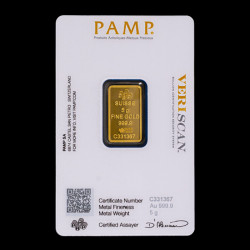 Partea din spate a lingoului conține informații despre greutate, finețe, marcă și numărul său de serie. Fiecare lingou de aur PAMP de 5 grame vine cu un număr de serie propriu, care este de asemenea indicat pe cardul de analiză.