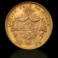 Monedele de aur de 20 de franci belgieni sunt monede istorice bătute în secolul al XIX-lea în timpul domniei lui Leopold II, care a fost monarhul Belgiei între 1865 și 1909. Monedele belgiene de 20 de franci au fost bătute între 1870 și 1882 și sunt unele dintre cele mai frecvent întâlnite monede de aur când vine vorba de monedele de aur belgiene. Unele dintre monedele bătute de Casa de Monedă a Belgiei au inscripții în franceză și flamandă. Puritatea ridicată de 90,00% a monedelor de 20 de franci belgieni face aceste monede de aur dorite atât de investitori, cât și de colecționari. Monedele de aur de 20 de franci Belges conțin 0,1867 uncii troi, ceea ce echivalează cu 5,81 grame. Greutatea totală a acestor monede de aur este de 6,4516 grame și au un diametru de 21,5 mm.
