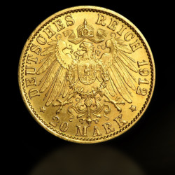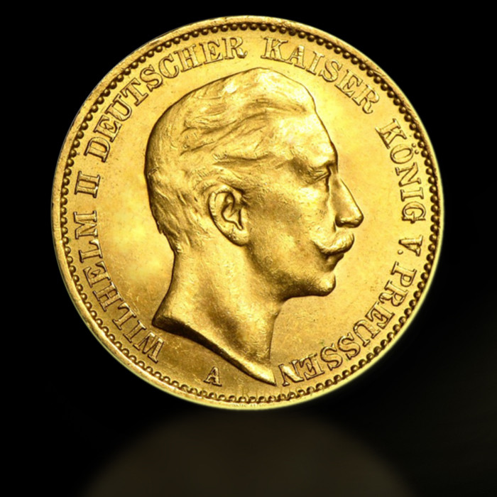 Monedele de aur de 20 Mărci au fost emise de Wilhelm II în timpul Imperiului German. Acestea au fost emise ca mijloc de plată legal în circulație zilnică în timpul domniei lui Wilhelm II ca împărat între 1888 și 1913. Cu două treimi din teritoriu și aproximativ trei cincimi din populație, Regatul Prusia este cel mai mare și cel mai puternic stat separat din Imperiul German. Wilhelm I, regele Prusiei din 1861, a fost proclamat primul împărat german pe 18 ianuarie 1871 la Palatul Versailles după victoria în Războiul Franco-German.