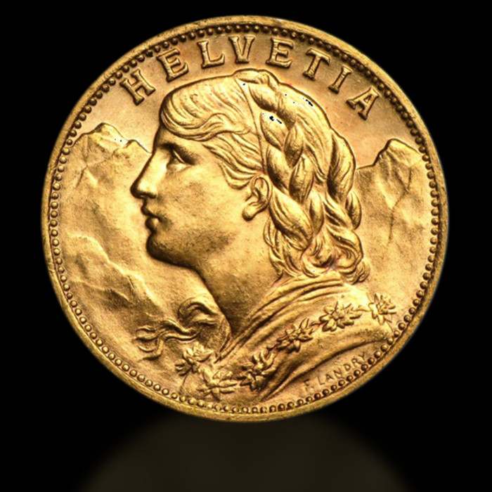 Aceste monede de aur comemorative sunt populare pentru frumusețea și raritatea lor. Produse de monetăria oficială a Confederației Elvețiene din Berna, aversul prezintă un portret al lui Vrenelli (capul Helveției), iar reversul prezintă crucea stemei Elveției.